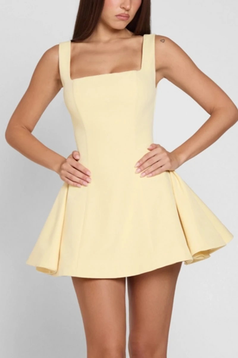 This mini dress features internal corset boning that sculpts and supports while the structured square neckline and straight sleeves balance the flared babydoll skirt for a flattering hourglass silhouette.
