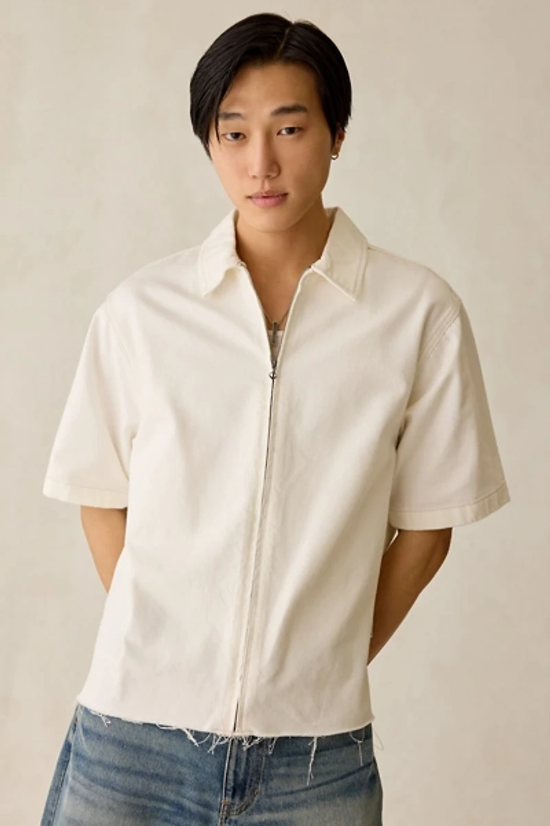 Short sleeve collared denim shirt by Lee. Features a premium cotton fabrication and a zip closure front. Slightly boxy fit shirt finished with a raw cut hem.