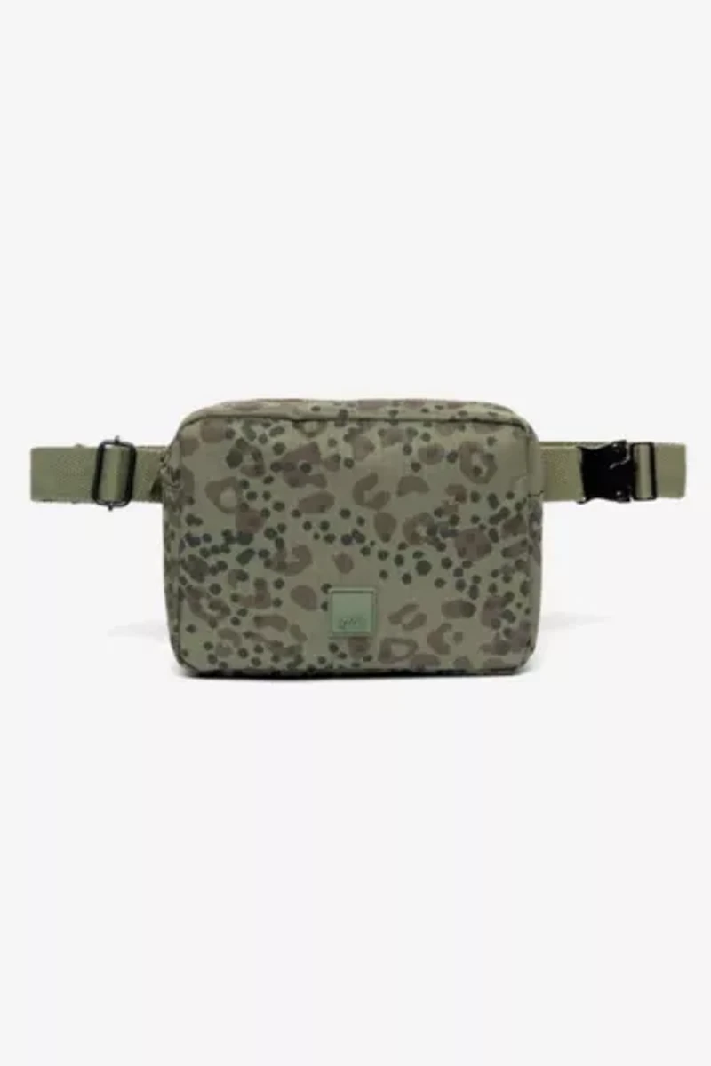 Square bum bag with an adjustable cotton strap that can also be worn as a shoulder bag. Main compartment has two interior pockets for better organization. Back zipped pocket for extra security.Metal buckle on the strap.
