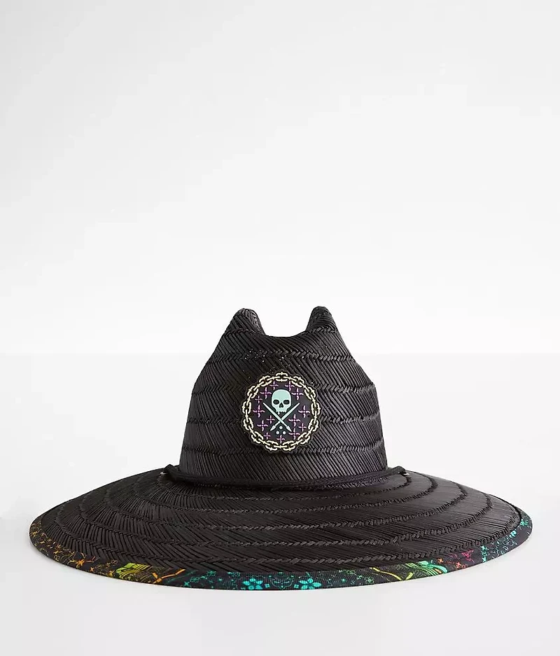 Embroidered patch weaved hat Gradient print 5" brim Adjustable chin strap One size fits most