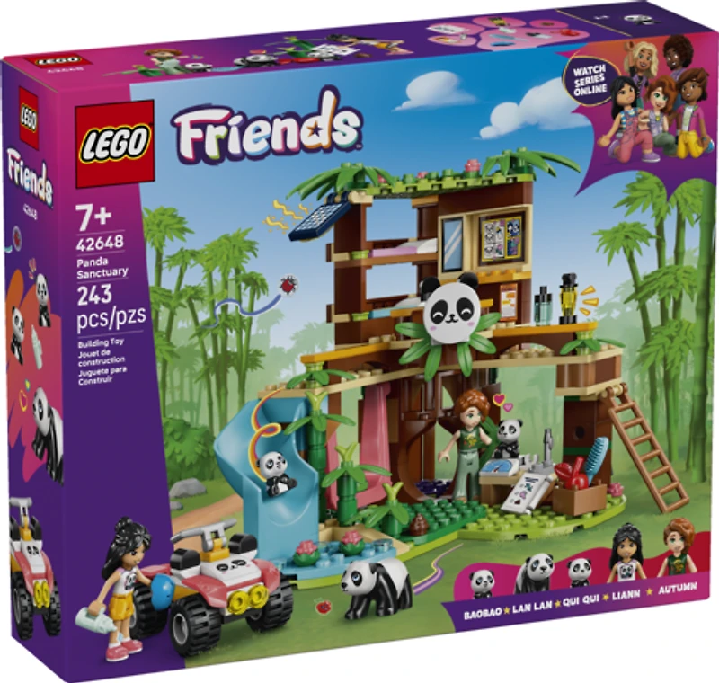 Discover a fun kids’ building set gift that’s packed with panda power! The LEGO® Friends Panda Sanctuary Animal Care (42648) set for girls, boys and animal-lovers aged 7 and up lets kids create their own panda rescue stories. The set comes with a buildable tree house and ATV, 2 minidoll characters and 3 panda figures to inspire creative pretend play. Get ready for paw-some playtimes as kids tell the story of Autumn and Liann, who are helping out at the panda sanctuary. The set comes with lots of accessories, including a weighing scale and grooming tools. This set is also full of humorous details – let the pandas whoosh down the slide into the water or enjoy a ride on the swing. The ATV is perfect for transporting the pandas’ favorite bamboo snacks. When the pandas take a nap in their cave, the friends climb the ladder into the tree house where there’s a desk and 2 beds. This set lets kids explore friendship themes while boosting their social development through nurture play. Panda toy building set – This Panda Sanctuary Animal Care set for girls, boys and young nature-lovers aged 7 years old and up comes with 2 minidolls, 3 panda figures and accessories for pretend play Tree house playset with ATV toy – The set comes with a buildable tree house, which is home to the panda sanctuary, plus an ATV to transport food and supplies to care for the animals 2 minidolls and 3 panda figures – This set tells the story of Autumn and Liann as they care for the mommy panda and her 2 babies, giving little animal-lovers plenty of inspiration for nurturing play Animal toy with accessories – Discover heaps of accessories to fuel creative storytelling, including a scale, brush, poop element, shovel, solar panel, lantern, phone, pen, bamboo, an apple and more A birthday gift for kids – This set makes a fun birthday gift or anytime treat for kids who love animal toys or for young nature-lovers who enjoy pretend play and friendship stories Online show – Inspire more creative-play ideas with other sets (sold separately) and the LEGO® Friends: The Next Chapter online show, where kids can get to know the characters of Heartlake City Let’s tell a friendship story – The LEGO® Friends range of building sets lets kids explore different friendship moments, with lots of opportunities to create their own imaginative adventures Measurements – 243-piece set with a main model measuring over 6 in. (15 cm) high, 7 in. (17 cm) wide and 6.5 in. (16 cm) deep
