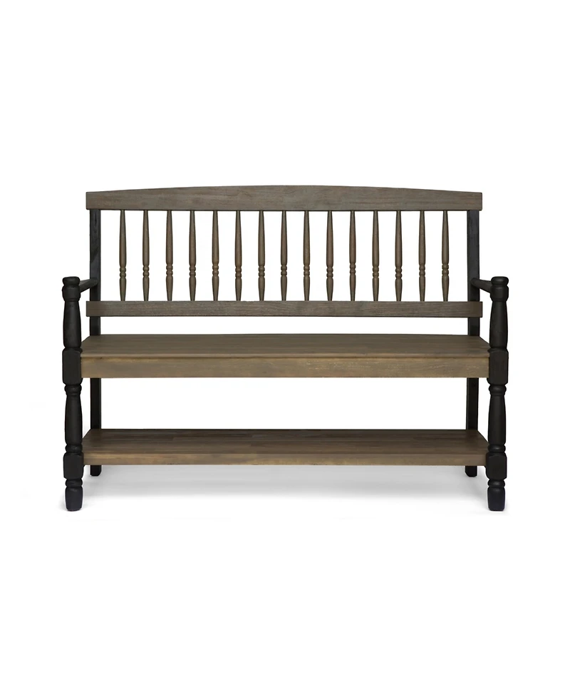 Classic and timeless, this farmhouse bench with a built-in shelf will not only add beauty to your home, but also act as a practical, understated means of storing previously cluttered possessions. With delicately carved acacia wood details and a sturdy frame, this piece is a gorgeous sight to behold.