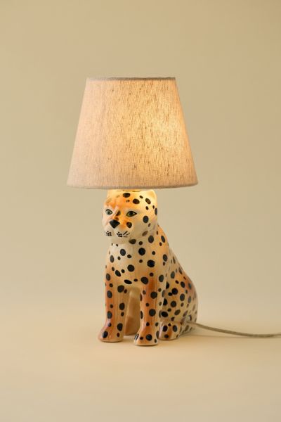 Go wild with your unique lighting displays with the help of this ceramic bedside lamp. This bedside lamp features a posing leopard-shaped base sculpted from ceramic with a tapered, woven fabric shade. Available exclusively at Urban Outfitters.