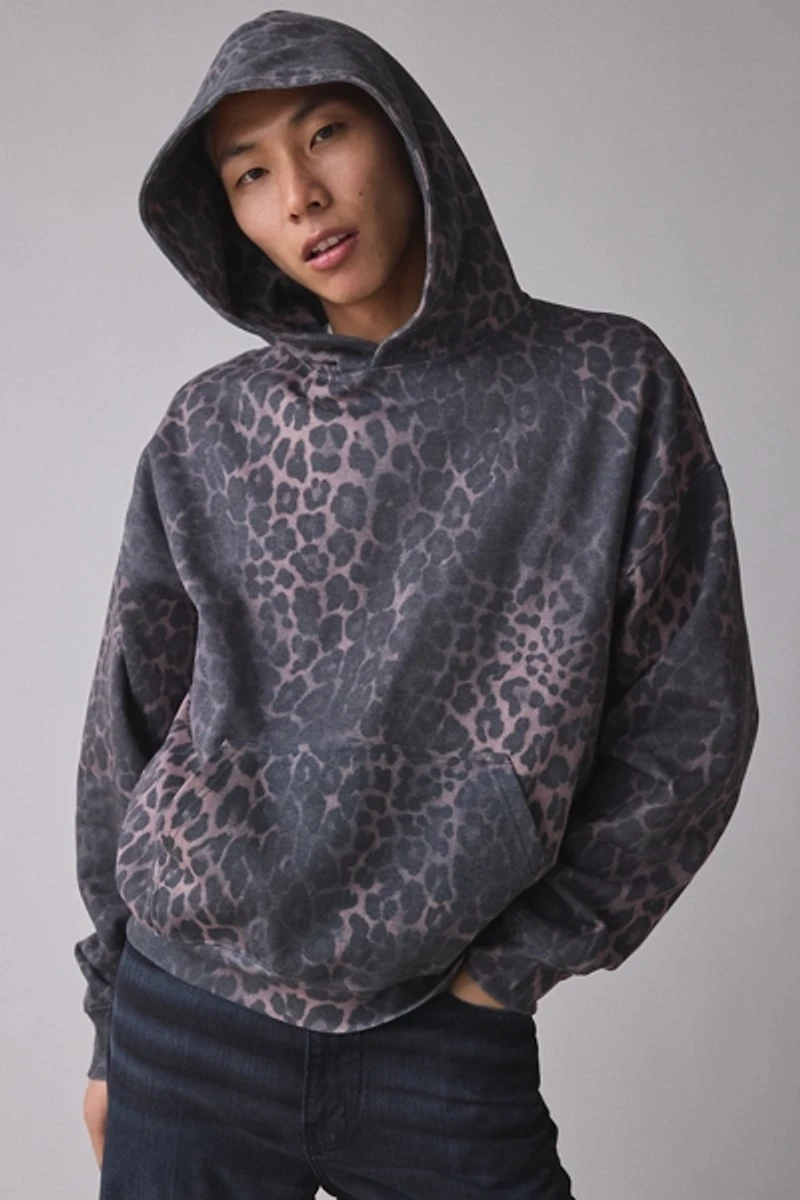 Bold allover leopard pattern hoodie. Pullover sweatshirt with a hood, pouch front pocket and ribbing trims. Casualwear staple for everyday layering.