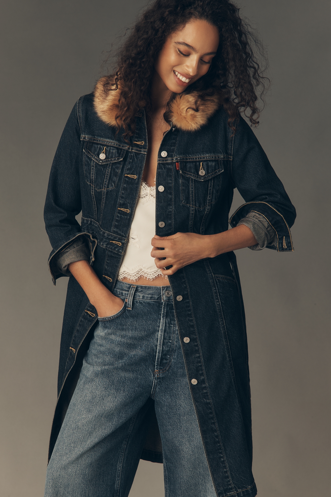 Levi's Faux Fur Collar Belted Denim Coat