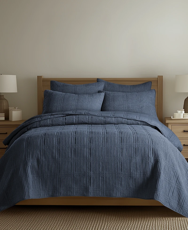 The Cloud Waffle Reversible Quilt Set by Levtex Home is inspired by textured fabric techniques. Features textured waffle weave on the front, reversing to a solid cotton on the back. Created from the softest cotton for an ultra soft feel that you will simply love. Our quilt is generously sized to give your bedroom a feeling of comfort and luxury.