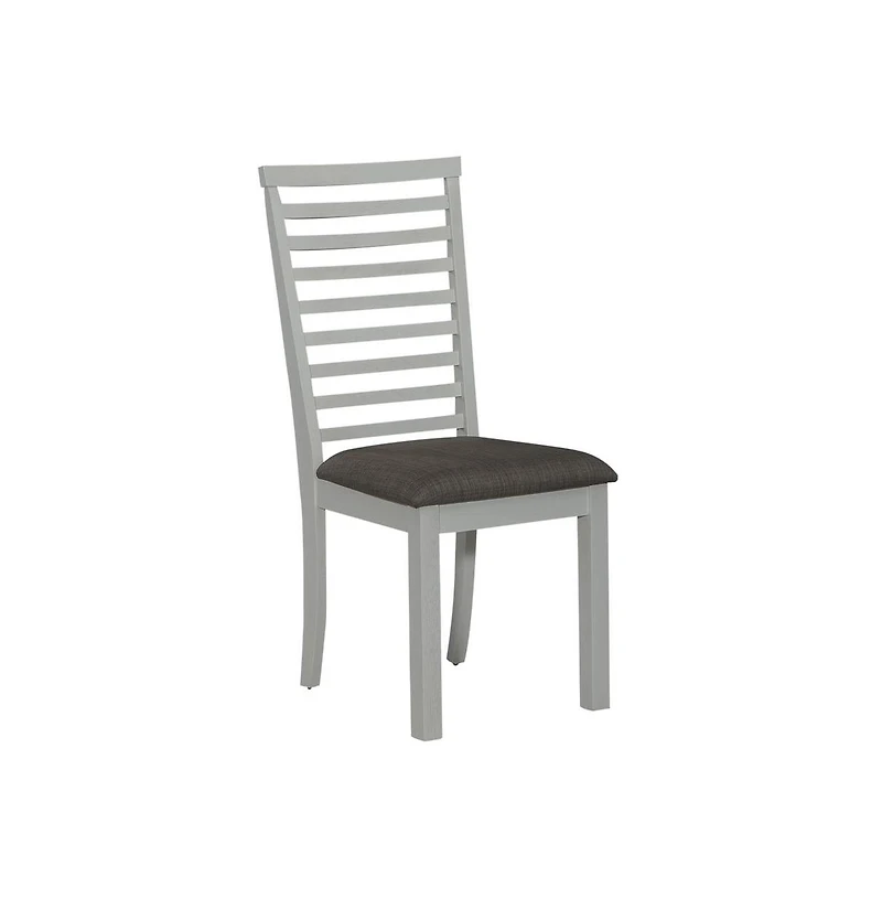 Feel at home with the Brook Bay upholstered ladder back side chair. Crafted with excellence using rubberwood solids, this chair features a Textured White finish. The seat is upholstered in 100% polyester Grey Linen fabric. The block legs feature nylon chair glides to protect your flooring. Feel comfortable and elegant at the same time with the Brook Bay upholstered ladder back side chair.