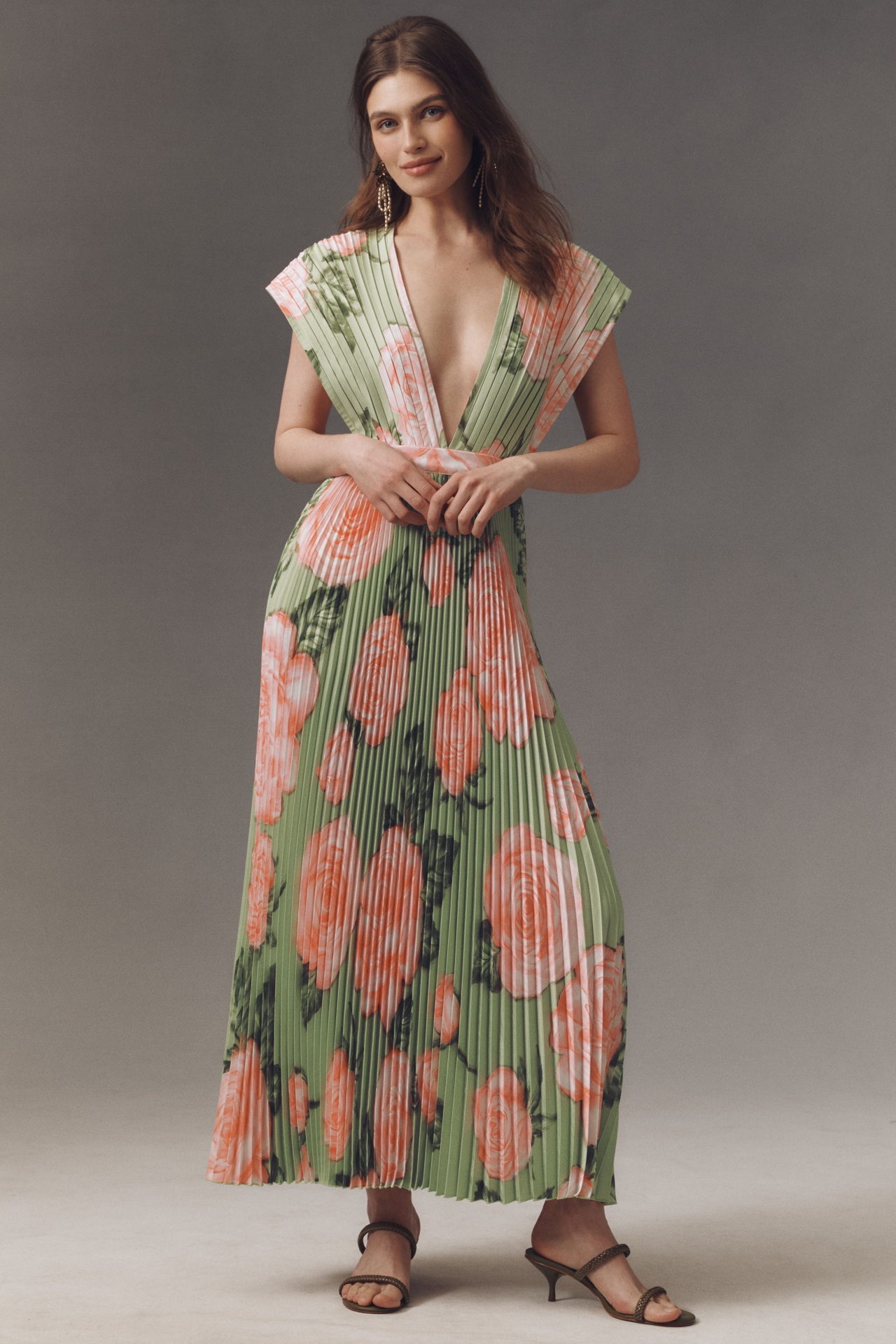 The L'IDÉE Gala Gown features a deep v neckline, breezy, open sides, and all-over pleats.