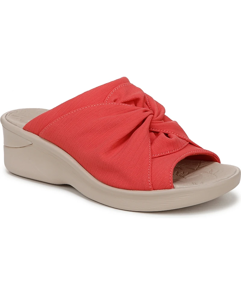 Slip into comfort. You won't be able to stop smiling every time you step into these slide sandals with a wedge. Stretch fabric or mesh stretch fabric upper with a round toe. Decorative bow detail. Slip-ons for easy on and off. Bzees Air Step Technology: Designed so you'll feel weightless, energized and free. Ultra Lightweight: Step lightly with a nearly weightless feel. Dynamic Stretch Fabrics: Move freely in shoes with built-in stretch. FreeFoam Comfort: Low pressure insoles with maximum foot contact and cushy arch support. Anti-Microbial and Odor Control technology. 1-inch platform, 2-inch wedge heel. Get Width It: Countless pairs of Bzees come in wide width shoes for women. Machine Washable: Wash on cold and air dry.