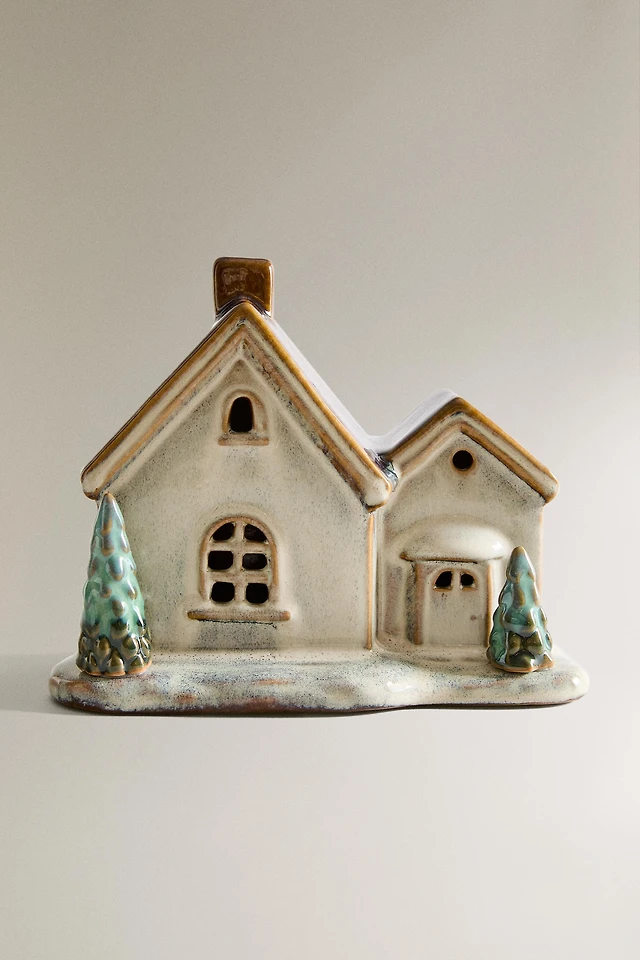 LIGHT-UP PORCELAIN HOUSE WITH PINE TREES CHRISTMAS ORNAMENT