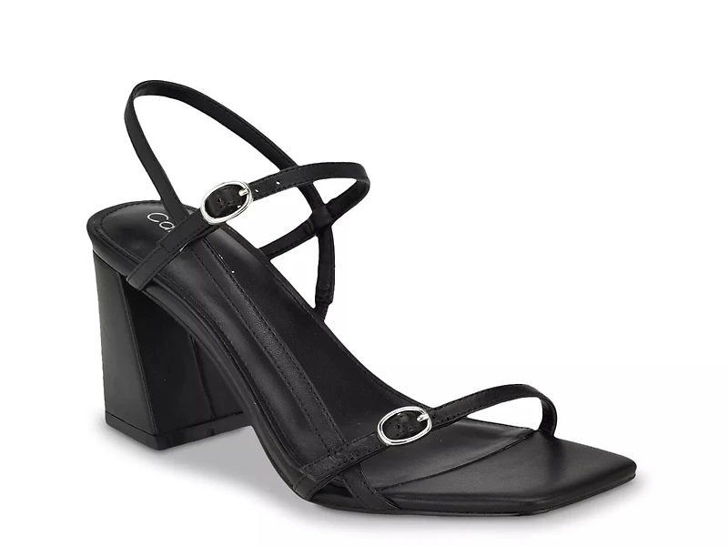 Bring sleek style to your wardrobe with the Calvin Klein Linella sandal. Thin straps, a dual buckle closure, modern square toe, and a chunky block heel make this adjustable sandal stylish from every angle.