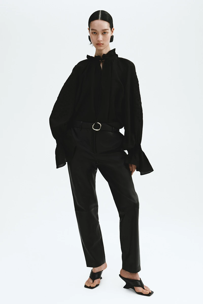 Oversized blouse in an airy woven linen and viscose blend. Pleated stand-up collar, V-shaped opening at front with narrow ties, and extra-long raglan sleeves with tone-on-tone embroidered details. Pleats at wrists for gently flared cuffs.