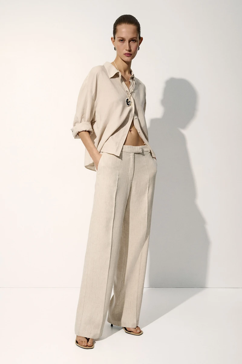 Dress pants in twill made from a linen and lyocell blend. High waist and extended waistband tab with concealed button and hook-and-bar fasteners. Diagonal side pockets, mock welt back pockets, and straight legs with creases at front and back.