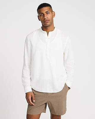 A breathable linen-blend shirt complete with a band collar, long sleeves, and a quarter button front.