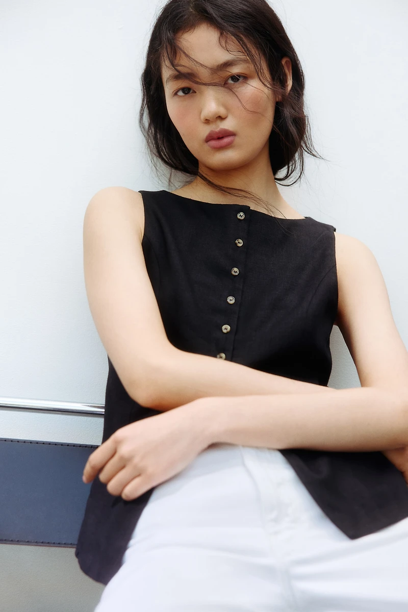 Vest in an airy woven linen and viscose blend. Delicate boat neck, buttons at front, and princess shaping seams at front and back. Ties at back of waist for a tapered effect. Lined.