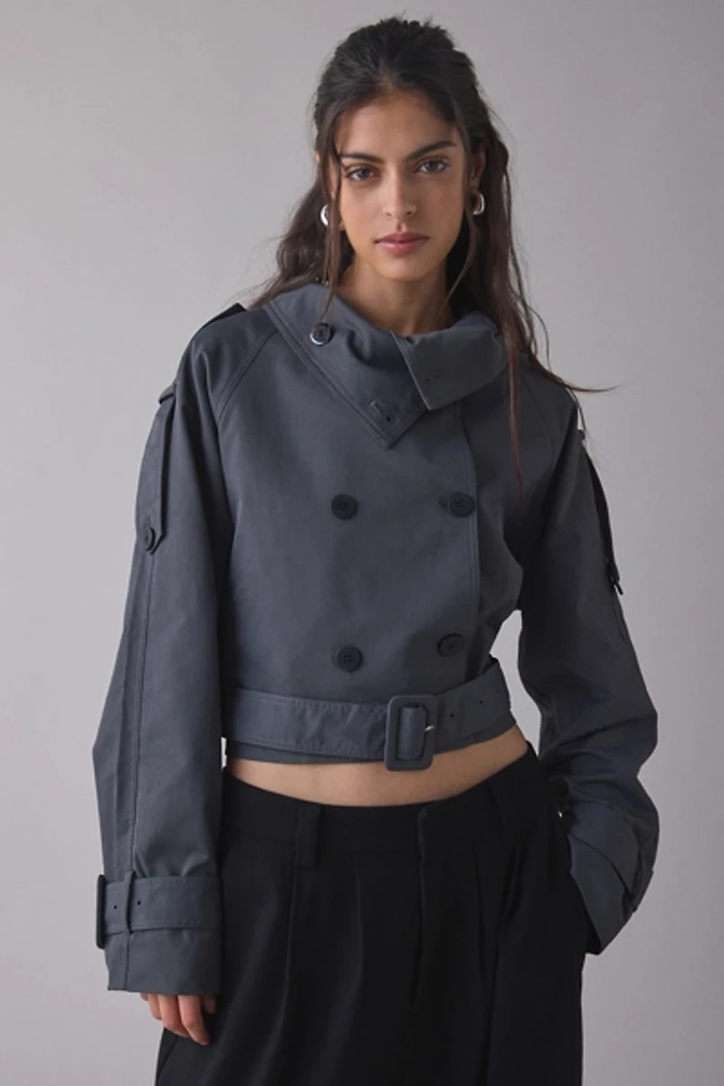Updated classic Lioness trench coat in a boxy & cropped silhouette. Short trench coat designed in a midweight twill featuring a funnel neckline, drop shoulders with epaulets, long sleeves with buckle cuffs, double-breasted buttons down the front and a belted hem for a personalized fit.