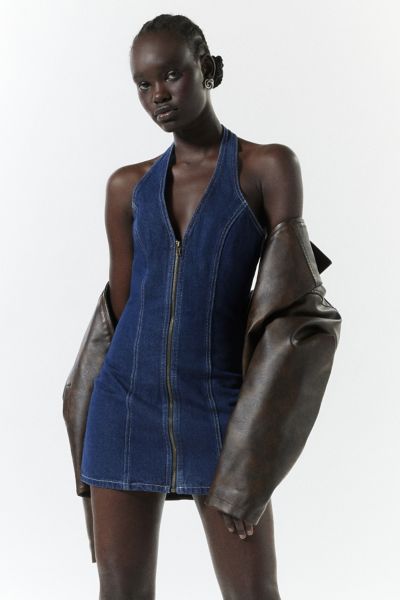 BDG Leah Denim Pleated Open-Back Drop Waist Mini Dress