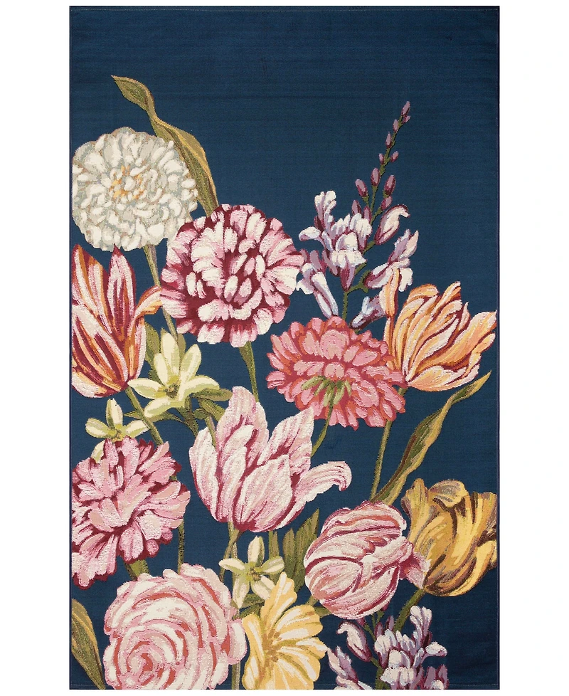 The Hallo Holland decorative area rug features an artistic garden bouquet of assorted blooms in pastel colors on a navy background.