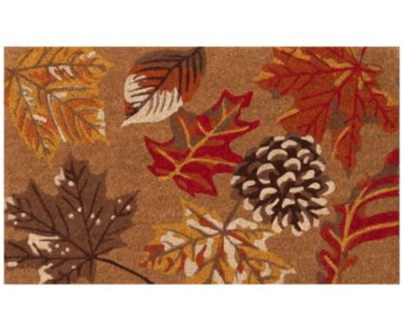 The Falling Leaves novelty mat features a scattered autumn leaf pattern that highlights the intricate shading and vibrant orange and rust colors of assorted leaves and pinecones on a natural background.