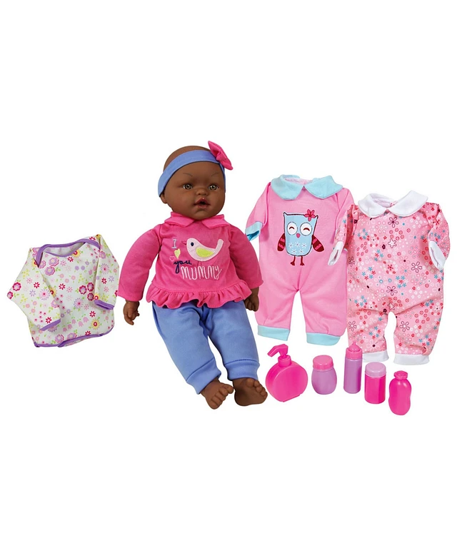 Jc Toys La Baby African American 14.3" Soft Body Baby Doll 3-Piece Outfit with Pacifier, Magic Bottle Set