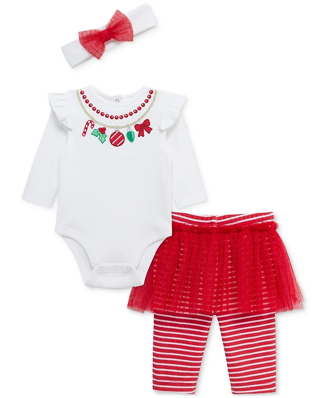 Little Me Baby Girls Necklace-Embroidered Holiday Bodysuit Headband & Skirted Leggings, 3 Piece Set