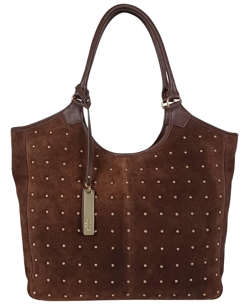The Vista Shopper in suede with a studded pattern detail on front is fabulous. This everyday tote is large enough to fit your laptop and all other belongings. It features a mag snap closure and back slit pocket.