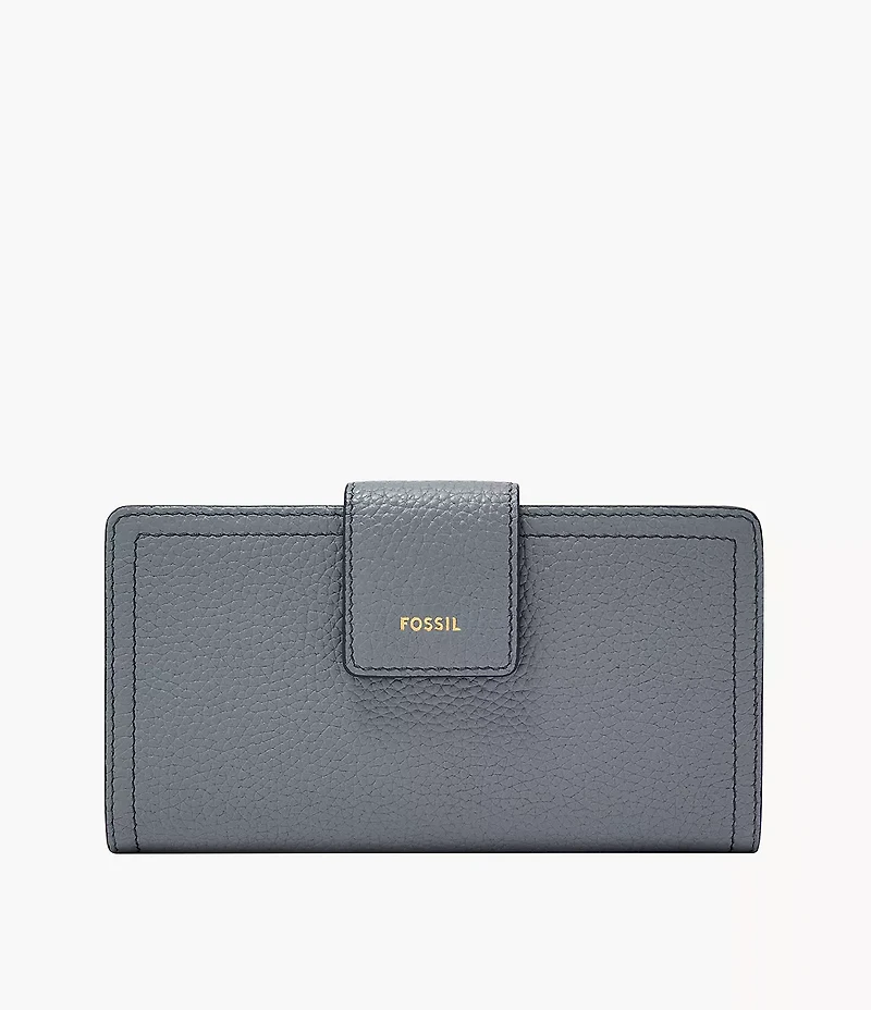 Crafted from leather, this tab clutch combines thoughtful design with functional organization. Its RFID-blocking technology helps protect your cards, and the interior includes twelve card slots, an ID window, four bill compartments, and a zip pocket for coins. A secure snap closure keeps everything in place, while its slim profile makes it easy to carry or slip into your bag.Fossil leather products support responsible manufacturing via the Leather Working Group (LWG).