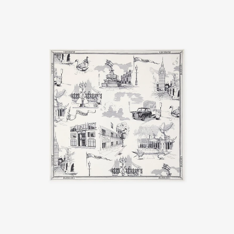 A scarf made in Italy from silk twill. The design is printed with hand-drawn artwork depicting iconic London landmarks including the Houses of Parliament, Tower Bridge, Trafalgar Square and our Horseferry House headquarters. Square Hand-rolled edges Printed Burberry lettering at border