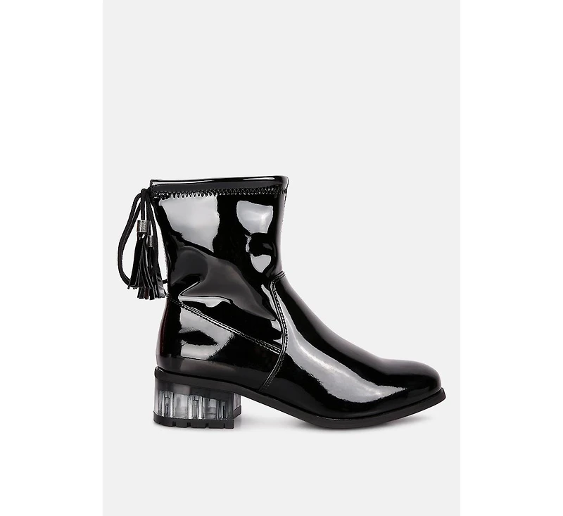 A staple in the wardrobe, these short-heeled boots are perfect for casual wear. The boots for women are versatile and the clear heel detail is an intriguing element. Their versatility makes them a go-to with almost all outfits, and the cushioned insole offers comfort.Outer material: Patent PULining Material: SyntheticOuter sole: TPRClosed Pointed ToeFlat Casual BootsSide Zipper OpeningAutumn/Winter BootsSH3936