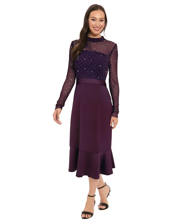 London Times Petite Twist-Waist Flounce-Hem Midi Dress