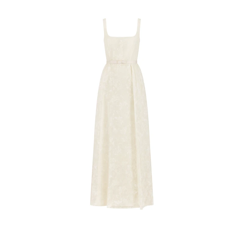 Unveiled at the Cruise 2026 Fashion Show, the long dress showcases Pietro Ruffo's Millefiori motif, inspired by baroque paintings. Crafted in ecru silk organza, it has an ethereal silhouette with a square neckline, gathered details and a tonal velvet belt highlighting the waist. The exceptional piece will create sophisticated, bold looks. Velvet tied belt. Rear zip closure. Gathered details at the waist. Tonal lining. 100% silk and lining: 100% silk. Made in Italy