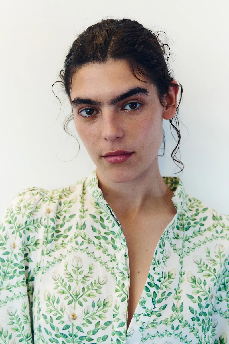 Ankle-length dress in airy, woven cotton. Band collar, concealed buttons at top, and short, balloon sleeves. Narrow, removable tie belt at waist and a flared skirt with gathered tiers for added volume. Unlined.
