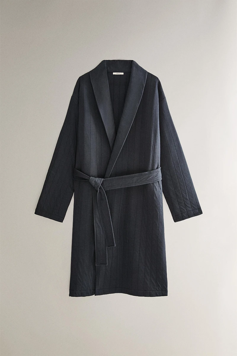 Long-sleeved dressing gown, made of quilted fabric, with a belt.