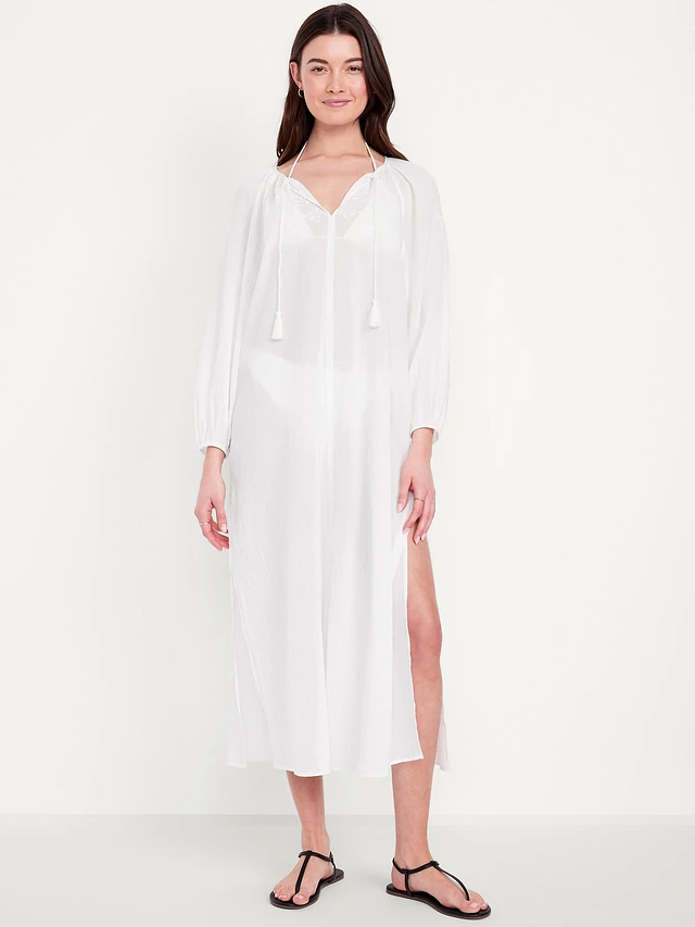 Split-Neck Crinkle Gauze Mini Swing Dress
