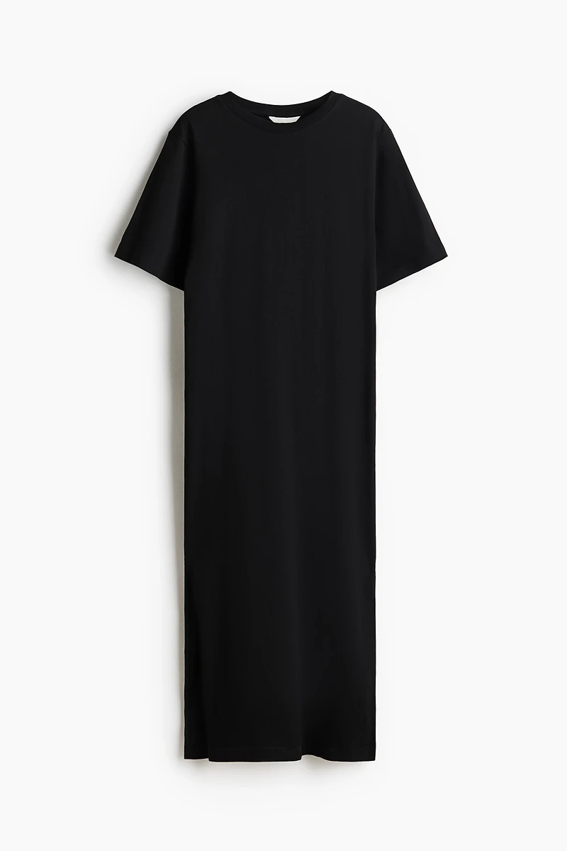 Long T-shirt dress in soft cotton jersey. Ribbed round neckline and a high slit at sides of hem.