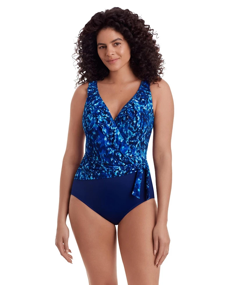 This classic wrap-style one-piece features a soft ruffle tie-front that accentuates curves and adds graceful movement. With soft cups, tummy control, and powernet front lining, it delivers a smooth, supportive, and flattering fit.