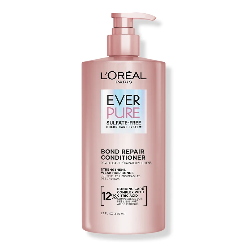 EVERPURE BONDING CONDITIONER 23FL OZ. Benefits: L'Oreal Paris EverPure Sulfate Free Bond Repair Pre-Shampoo treatment, Shampoo, Conditioner, and Oil-in-Serum strengthen weak hair bonds, reduce breakage, and provide hydration and lasting smoothness plus color protection.. EverPure premium hair care system with bond repairing shampoo and conditioner is formulated for color treated, bleached hair, damaged hair, weak hair, fragile hair, and thin hair.. L'Oral's Purest Respect For Your Hair - Formulated without sulfates, parabens, synthetic fragrance, added phthalates, gluten ingredients, DMDM Hydantoin, and dyes.. Always vegan, color caring, and powered by science.. Bond Repair Pre-Shampoo, Shampoo, Conditioner, and Oil-In-Serum for color treated, fragile hair infused with citric acid and a floral scent with notes of rose and sandalwood, reinforces weak bonds, leaving hair silky smooth.. For best results, use our Bond Repair system daily or on wash day. To style after the shower, apply a small amount of the Oil-in-Serum to damp or dry hair.. : :