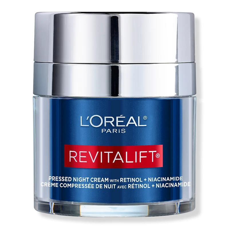 RVTL PRSD NGT CRM W PURE RTNL 1.7OZ. Benefits: Revitalift Pressed Night Cream to visibly reduce wrinkles, even tone and deeply moisturize. Retinol, Niacinamide are balanced with soothing ingredients- Panthenol, Glycerin, Hyaluronic acid. L'Oreal's 1st fresh-pressed jar is hygienic, easy to dose. Allergy tested. It is non-greasy, absorbs quickly and does not clog pores. Suitable for all skin types. See fewer wrinkles, firmer, more radiant skin. Key Ingredients: Retinol [Vitamin A], a top dermatologist recommended anti-aging ingredient known to fight key signs of aging such as wrinkles and uneven skin texture. Niacinamide, Vitamin B3, an essential nutrient that helps strengthen skin's natural protective barrier and brighten skin overall, for a healthier looking complexion. 12% soothing complex of Panthenol, Glycerin, Hyaluronic acid and nourishing emollients to balance powerful Retinol and leave skin feeling deeply moisturized. Formulated Without: Fragrance. Parabens. Dyes. Mineral Oil.