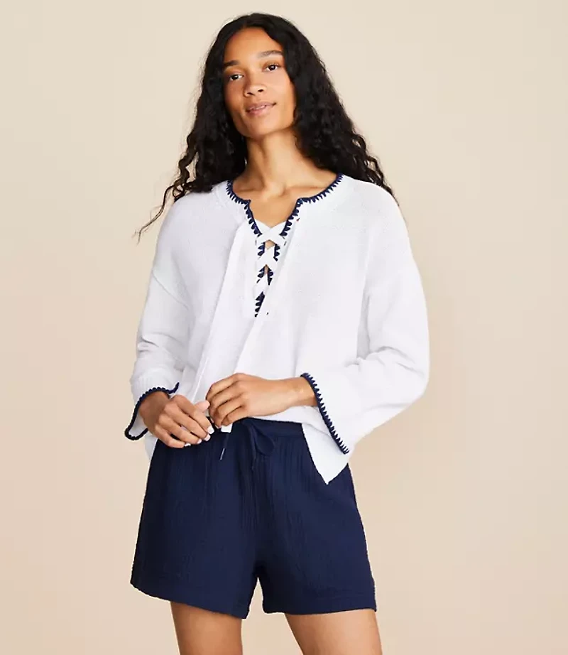 Hit: Hits at hip, Imported:, Fit: Classic follows your contours with a little room, Length: 22 1/2"long, Fabrication: 53% Polyester 47 Cotton, Garment Care: Machine Washable Lou & Grey Crochet Lace Up Sweater Size XS White Women's by Lou & Grey Size Regular - XS White Women's V - Neck, 3/4, Sleeve Pullover Sweaters 53% Polyester 47% Cotton Machine Washable Best Fall Sweaters