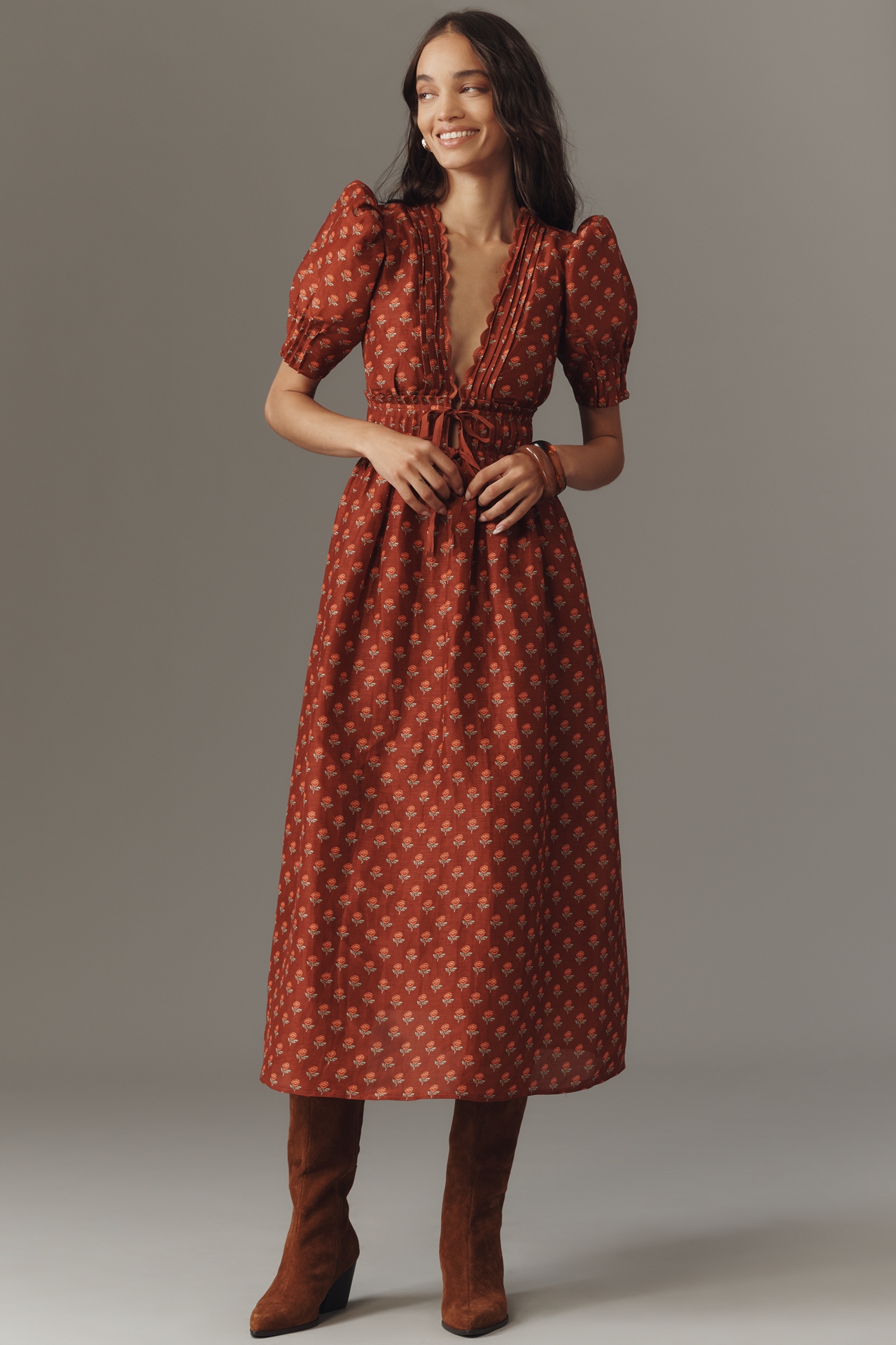 Lovaan Boehm Linen-Silk Puff-Sleeve V-Neck Midi Dress in Bloomington, MN