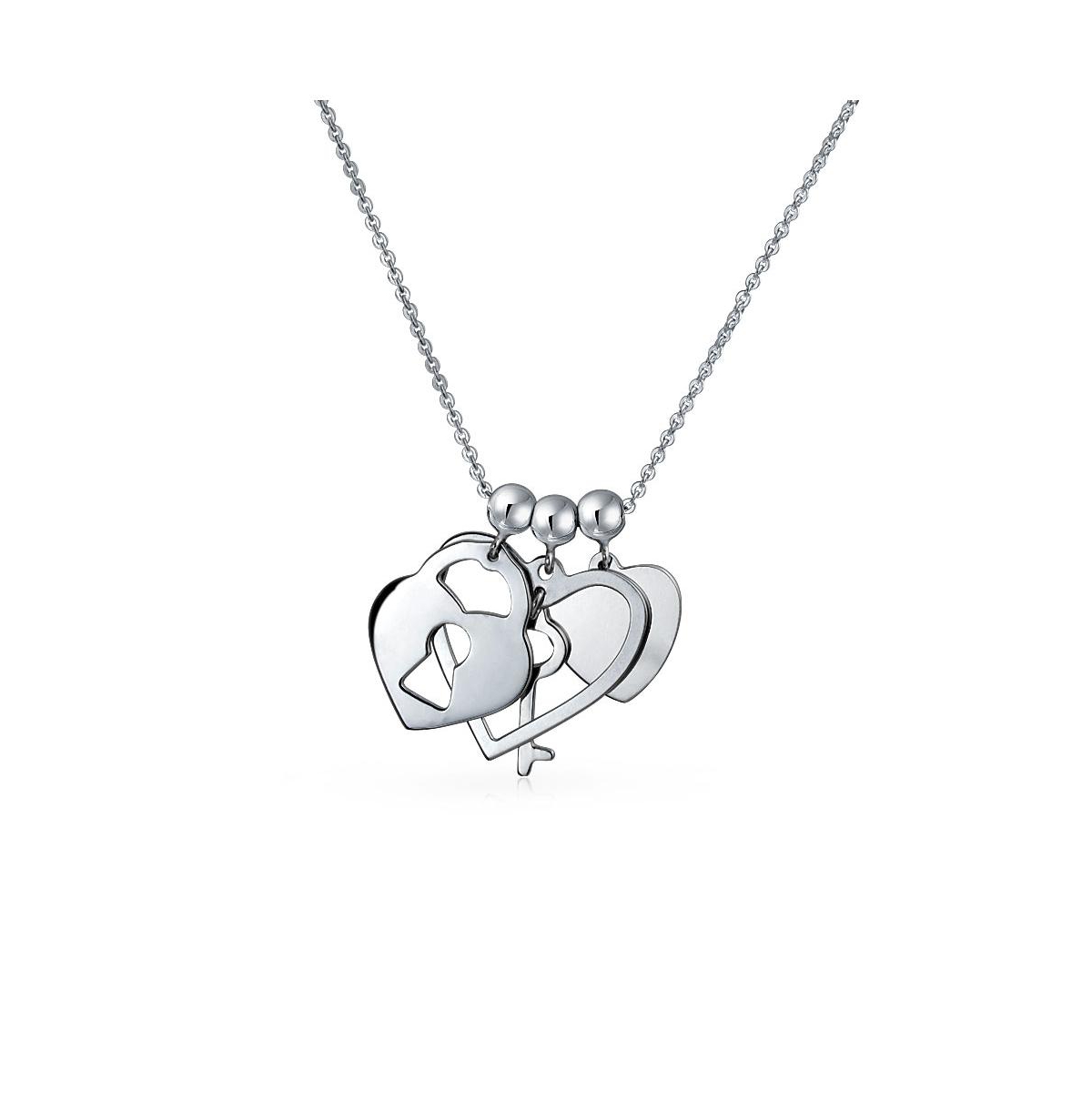 Love Lock And Key Heart 3 Charm Pendant Necklace .925 Sterling Silver