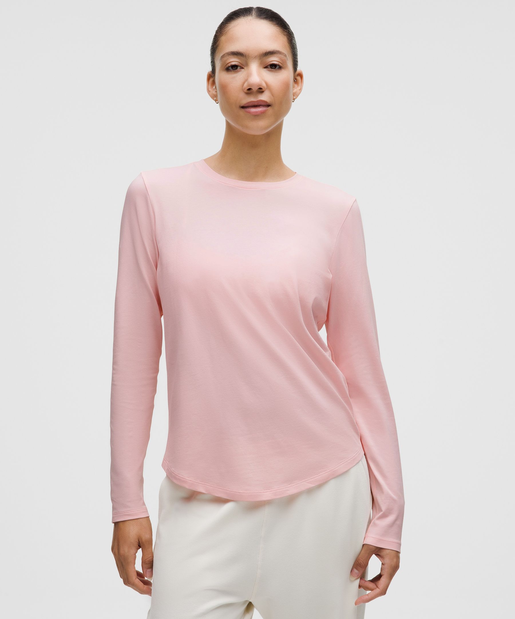 Lots of reasons to love this long sleeve. Soft cotton fabric, a hint of stretch, and a just-right curved hem that pairs perfectly with leggings.