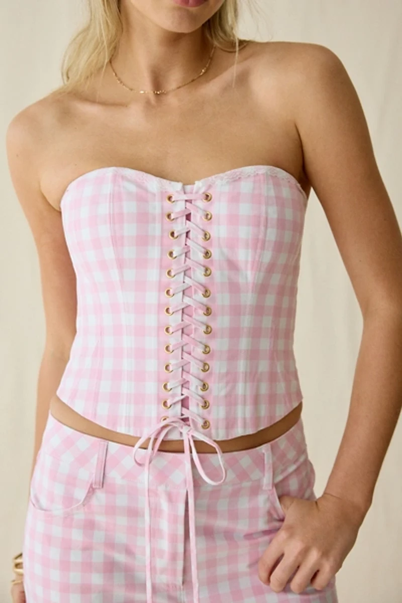 LoveShackFancy Bensen Cotton Gingham Lace-Up Bustier Top in Bloomington, MN