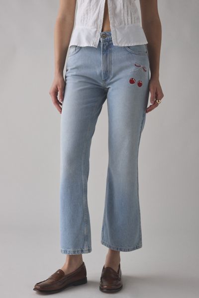 Leave it to LoveShackFancy to make jeans this femme! Straight leg jean designed in classic 100% cotton rigid denim featuring a mid-rise waistline, 5-pocket styling and charming bow & cherry embroideries for a sweet finish.