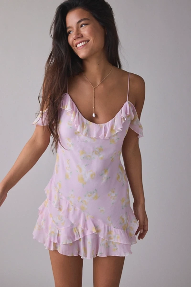 Romantically ruffled LoveShackFancy mini dress designed in a lightweight, flowing chiffon. Short floral dress featuring a scoop neckline, cold-shoulder flutter sleeves and ruffle trims throughout for an ultra-femme finish. Pairs perfectly with kitten heels for a cute party outfit ready for your next RSVP!