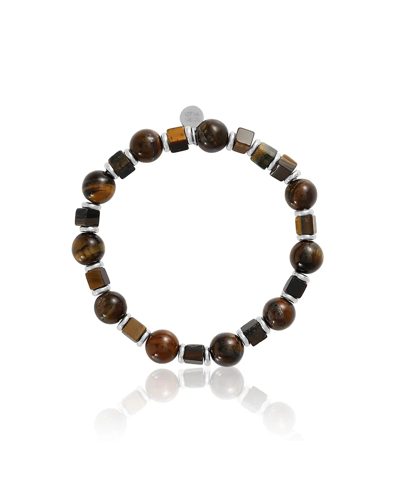 Grounded neutrals, effortless fit. Round tiger eye beads alternate with hematite tone cubes and metal spacers for rich texture. The stretch design slips on easily and stacks with leather and chain pieces.