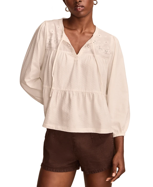 Lucky Brand Women's Cotton Embroidered Babydoll Tie-Neck Top
