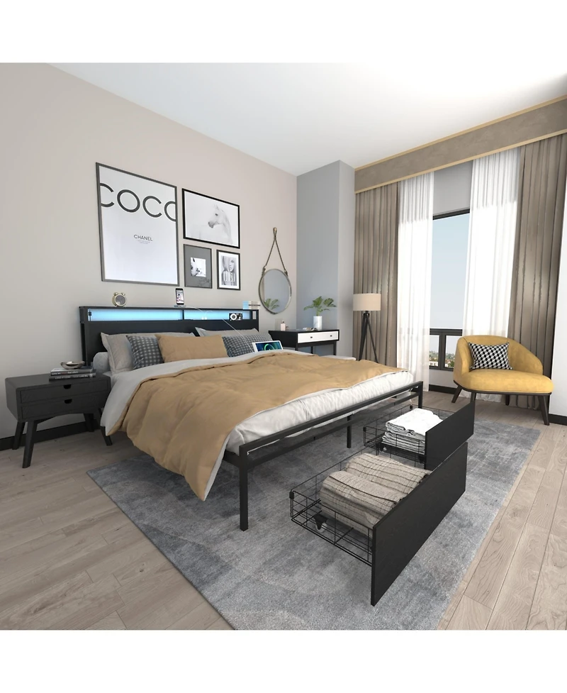 This bed frame combines bedroom style with practical everyday function. Features storage headboard, storage drawers, charging station, and Led lights. Built with noise-free support for dependable everyday performance.