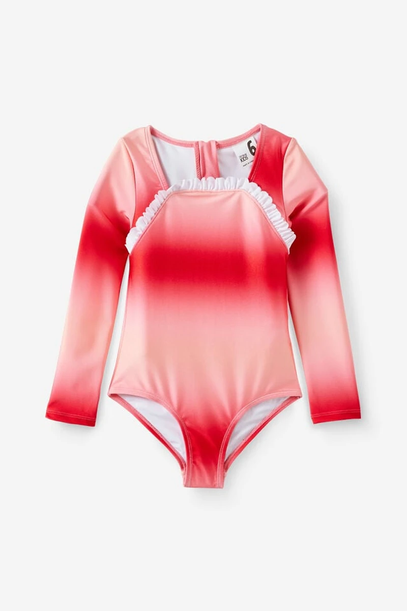 Give them comfort that keeps up. The Lulu Long Sleeve One Piece is ready for beach days, pool time, and everything in between. A high neck and long sleeves offer extra coverage, while a centre back zipper makes getting dressed easy. The full coverage brief and tie-dye ombre print in sunkissed pink and varsity red add fun to every swim.