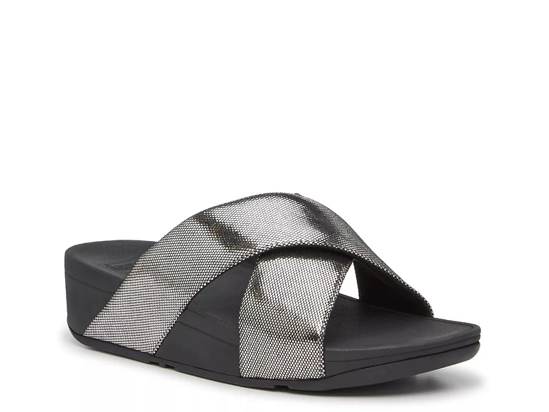 Add some sparkle to your casual steps with the Lulu Shimmer wedge sandal from FitFlop. This simple silhouette is elevated by crisscrossing straps and a shimmering hue for an eye-catching touch to a summertime staple. Crafted with a special MICROWOBBLEBOARD™ midsole that offers major cushioning and a reduction in pressure so every step feels better than the last.